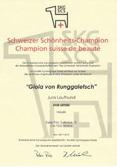 Dank dem Spitzenresultat vom Prüfungsjagen in Siebnen mit 139 Punkten und den 3 CAC und BOB an den int. Ausstellungen in St. Gallen und Lausanne wurde Gioia v. Runggaletsch, Besitzer Fritz Keller aus Trimmis, Schweizer Schönheitschampion.