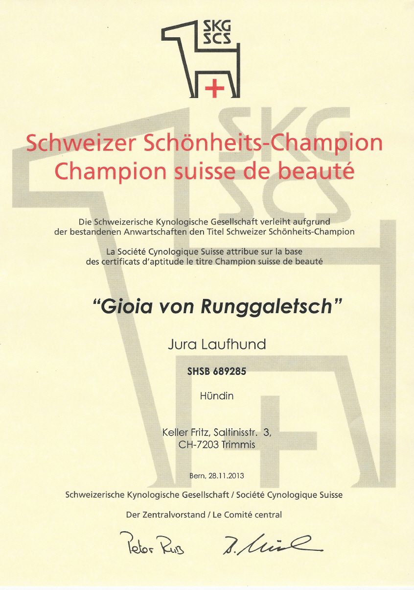 Dank dem Spitzenresultat vom Prüfungsjagen in Siebnen mit 139 Punkten und den 3 CAC und BOB an den int. Ausstellungen in St. Gallen und Lausanne wurde Gioia v. Runggaletsch, Besitzer Fritz Keller aus Trimmis, Schweizer Schönheitschampion.